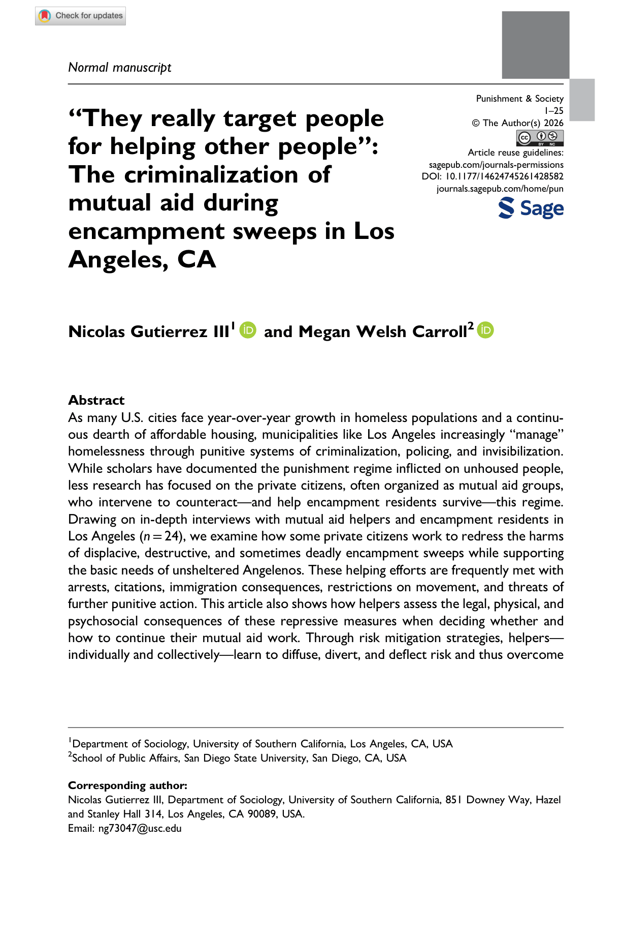 MEDIA PUBLICATIONS “They Really Target People for Helping Other People”: The Criminalization of Mutual Aid During Encampment Sweeps in Los Angeles, CA (Punishment & Society, 2026) Black Lives Experiencing Homelessness Matter: A Critical Conceptual Framework for Understanding How Policing Drives System Avoidance among Vulnerable Populations (Public Integrity, 2022) Community Acceptance of, and Opposition to, Homeless-Serving Facilities (International Journal on Homelessness, 2023) DUI to Deportation: What H.R. 875 Could Mean for Immigrant Communities (ERI Blog, 2025) Understanding Community Acceptance of and Opposition to Homeless-Serving Facilities (Scholars Strategy Network, 2022) “I’m Mostly Trying to Keep My Friends Alive”: Community Resistance to Homeless Encampment Sweeps in Los Angeles, CA (Master's Thesis, 2023) NEWS COVERAGE Studies Show Policing Doesn’t End Homelessness. San Diego Officials Double Down Anyway (inewsource) Council Grapples With Report on Policing Impacts Unhoused Black San Diegans (Voice of San Diego) ‘I Know I’m Black, but I’m Not a Criminal’ | SDSU Researchers Find Racism in SDPD’s Treatment of Unhoused Black People (CBS 8 San Diego) Disconnect Between How SDSP Says It Interacts With Homeless and What Unhoused People Report: Study (NBC 7 San Diego) Buscan Prohibir Campamentos de “Homeless” en vía Pública (Televisa Californias – Tijuana, BC, MX) Detractors Fear Tent Crackdown Will Make Things Worse for Black Homeless Residents (Voice of San Diego) Mayor Gloria, Councilmember Whitburn Announce New Efforts Against Homelessness (ABC 10News San Diego) Study Highlights San Diego Police Handling of Homeless Issues (NewsRadio AM 600 KOGO) San Diegans Want Homeless Solutions but Not in their Backyards (Voice of San Diego)